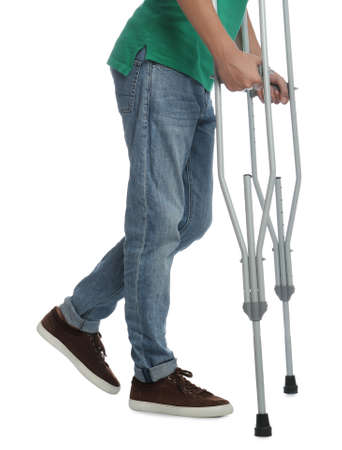 Man with injured leg using crutches on white background, closeup