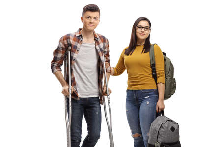 Male student with crutches and a female student helping him isolated on white background