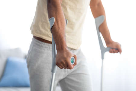 Cropped view of young black guy using crutches, having leg injury or broken bone at home