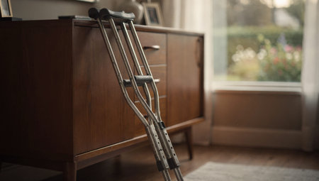 A pair of metal crutches leaning against a wooden mid-century cabinet in a softly lit room symbolizing recovery resilience and the process of healing from an injury.