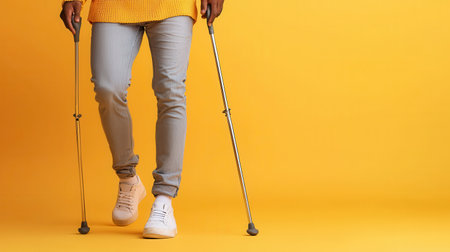 A person is walking with crutches against a vibrant yellow background, showcasing determination and resilience. This image represents empowerment and support in mobility.