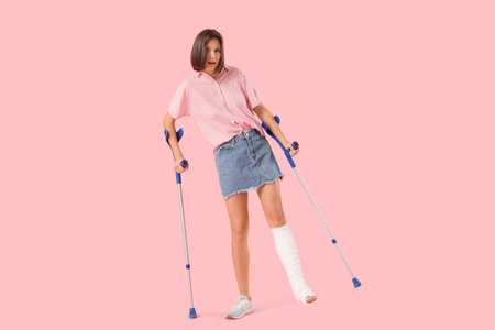 Young woman with broken leg and crutches on pink background