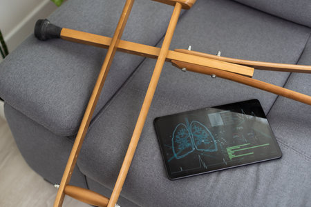 crutches with tablet, recovery and therapy