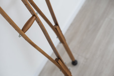 Pair of axillary crutches near light gray wall. Space for text