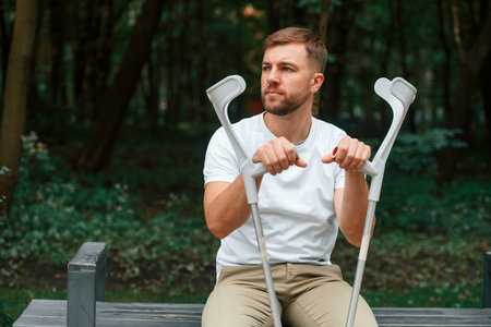 Sitting, feeling bored and sad. Man with crutches is in the park outdoors. Having leg injury.