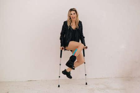 Portrait of happy woman with crutches on gray background. Space for text