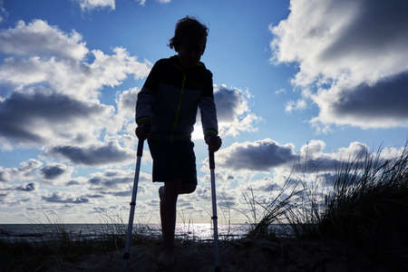 Silhouette of a little boy standing with crutches on the beach.