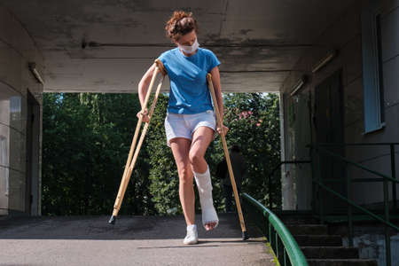 young women with broken leg on crutches.