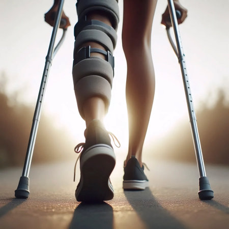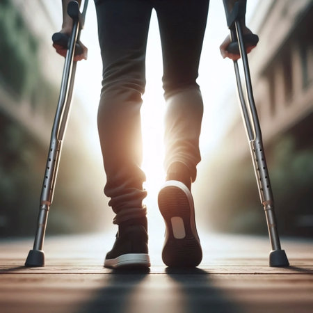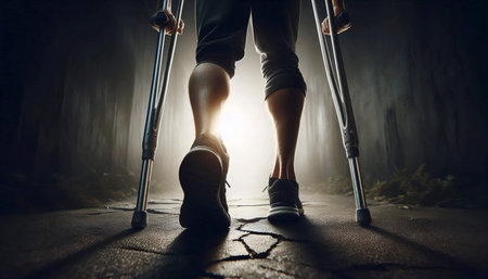 A person using crutches from a rear low-angle view, Ai generated image