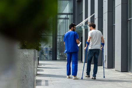 Man with crutches and a male nurse in a blue uniform walking in a hospital yard