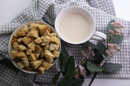 Cup of milk and croutons on table, top view
