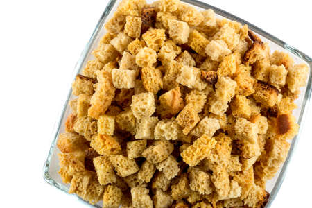 Homemade Crispy Bread Croutons in a Bowl, side view. Close-up.