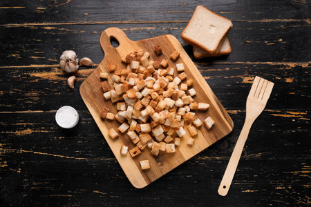 Board with croutons, spatula and garlic on black wooden background