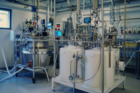 A row of industrial pharmaceutical reactors processing raw materials.