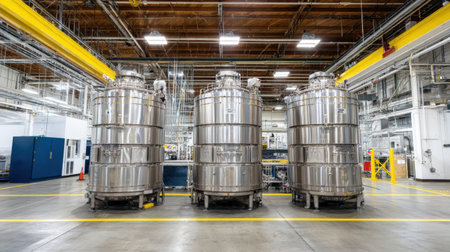 A view of three stainless steel storage tanks in a bright industrial facility, showcasing modern manufacturing processes and clean design.