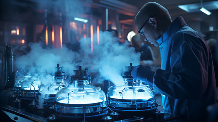 Embryologists with liquid Nitrogen bank containing sperm and eggs samples. High tech laboratory equipment used in the in vitro fertilization process. IVF treatment. Artificial insemination clinic