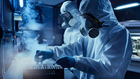 Researchers in protective suits work at illuminated stations in a high-tech environment filled with mist.