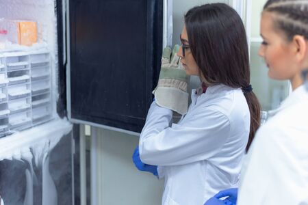 Scientists work in the laboratory. Remove the biomaterial from the freezer