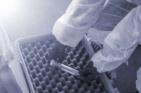 Scientist placing biological specimens into cryogenic container for preservation