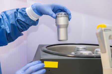 A laboratory technician wearing gloves and a sanitary uniform holds the container with a blood sample to be introduced into a centrifuge for analysis. Copy space. Concept of health and medicine