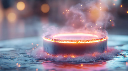 A vibrant, glowing ring hovers above a platform covered in frost, creating a captivating visual in a cold environment
