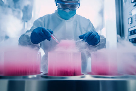 Medical worker in blue scrubs and gloves carefully handling a vial with a human embryo, storing it in a liquid nitrogen cryostorage tank for future use in fertility treatment
