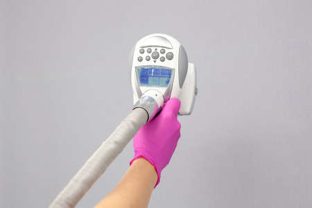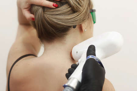 cosmetician hands make laser hair removal depilation procedure on woman neck closeup photo