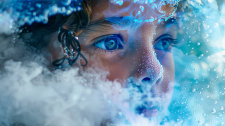 Close-up of a woman's face during cryopreservation, surrounded by ice