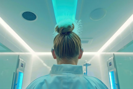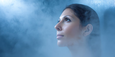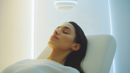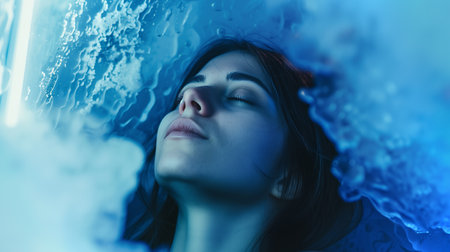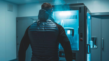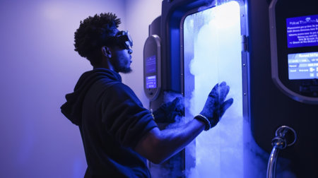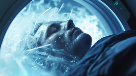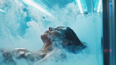 In a futuristic scenario, an individual receives cryotherapy treatment for health advantages in a cuttingedge clinics cool and refreshing ambiance