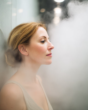 A woman is positioned near a steam source at a wellness center. She is engaged in a steam treatment while focusing on skin care. The session highlights self-care and health.