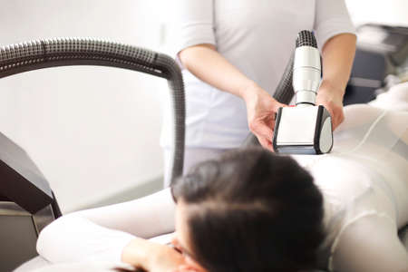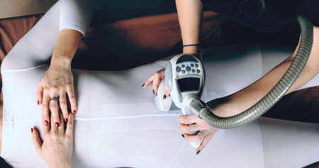 Woman getting cryolipolysis anti-fat anti-cellulite freezing treatment procedure in spa salon. Hardware cosmetology