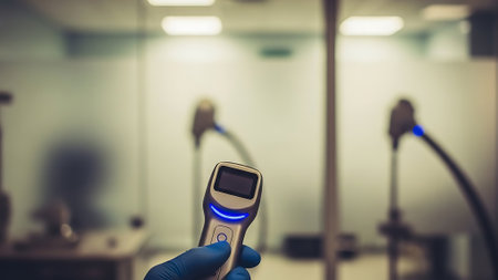 Scientist using infrared thermometer for measuring body temperature in laboratory.