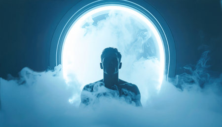 Man emerging from cryogenic chamber surrounded by mist in a futuristic laboratory.