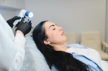 Hair doctor checking hair. Diagnostics hair and scalp. Trihoskopiya. Doctor examine patient female hair a special apparatus and computer