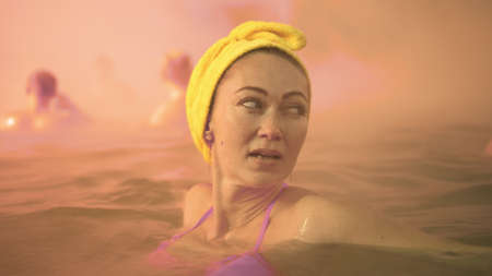 Close up caucasian woman in a swim in hot saline mineral water bath at a traditional spa outdoor with soft magic pink lighting and steam. Girl relaxing spring in hot geothermal spa pool is towel cap.