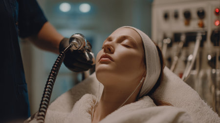 A woman relaxes with her eyes closed, undergoing a facial treatment with specialized equipment in a modern spa setting.