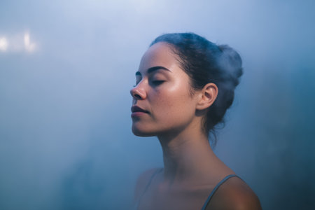 A woman stands still in a foggy space, eyes closed, experiencing a moment of stillness. The mist surrounds her, creating a soft atmosphere as she focuses on her thoughts.