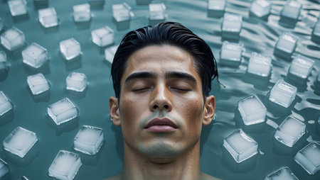 AI Generated. Man in water surrounded by ice cubes taking an ice bath for cold therapy treatment