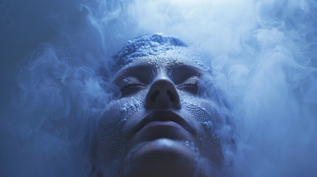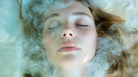 A gentle mist curls around the smooth folds of white fabric, creating an ethereal atmosphere. Soft blue hues enhance the tranquil ambiance, inviting a sense of calm and serenity.