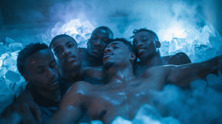 A group of athletes huddled together in an ice bath using cryotherapy to soothe their muscles and joints