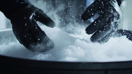 Scientist manipulating dry ice in laboratory setting