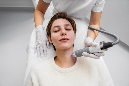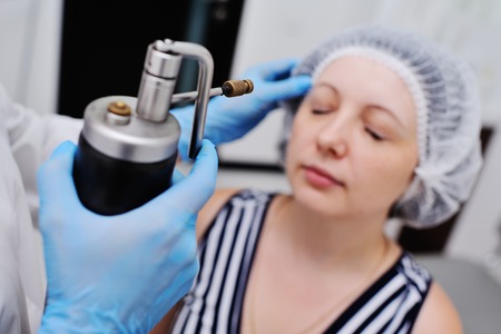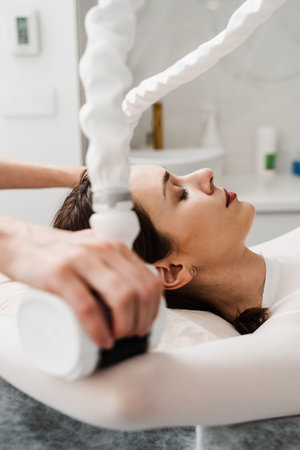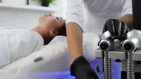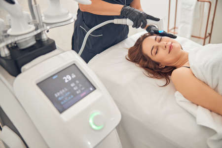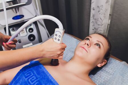 Beautiful brunette woman relaxing while getting procedure at beauty center with help of special electric device