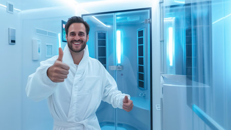 A man is seen enjoying a cryotherapy session in a hightech spa, giving a thumbs up. Cooling therapy equipment is visible in the modern environment