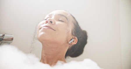 Music, face or happy woman in a bath in hotel cleaning, grooming or body care in soap foam. Relax, earphones or calm lady lying in water in spa, home or bathroom streaming or listening to radio song