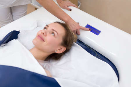 Top view of client getting procedure at beauty center with help of special device