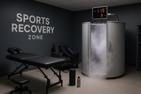 Modern sports recovery room equipped with cryotherapy chamber, massage table, and pneumatic compression boots