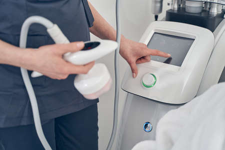 Cropped photo of a professional beautician with a modern tool touching the screen of a body contouring device
