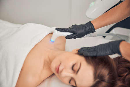 Woman with closed eyes while getting procedure at beauty salon with help of cavitation device