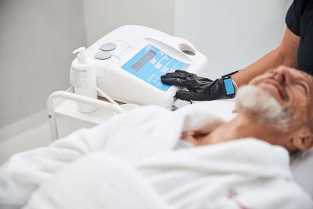Cropped photo of a spa therapist wearing black massage gloves while pressing a button on an apparatus