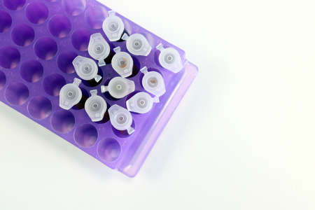 Micro Centrifuge tube with blood sample in solution, for testing anti-biotic with tips micropipette and purple eppendorf racks isolated in white background, biotechnology experiment for anti-virus.